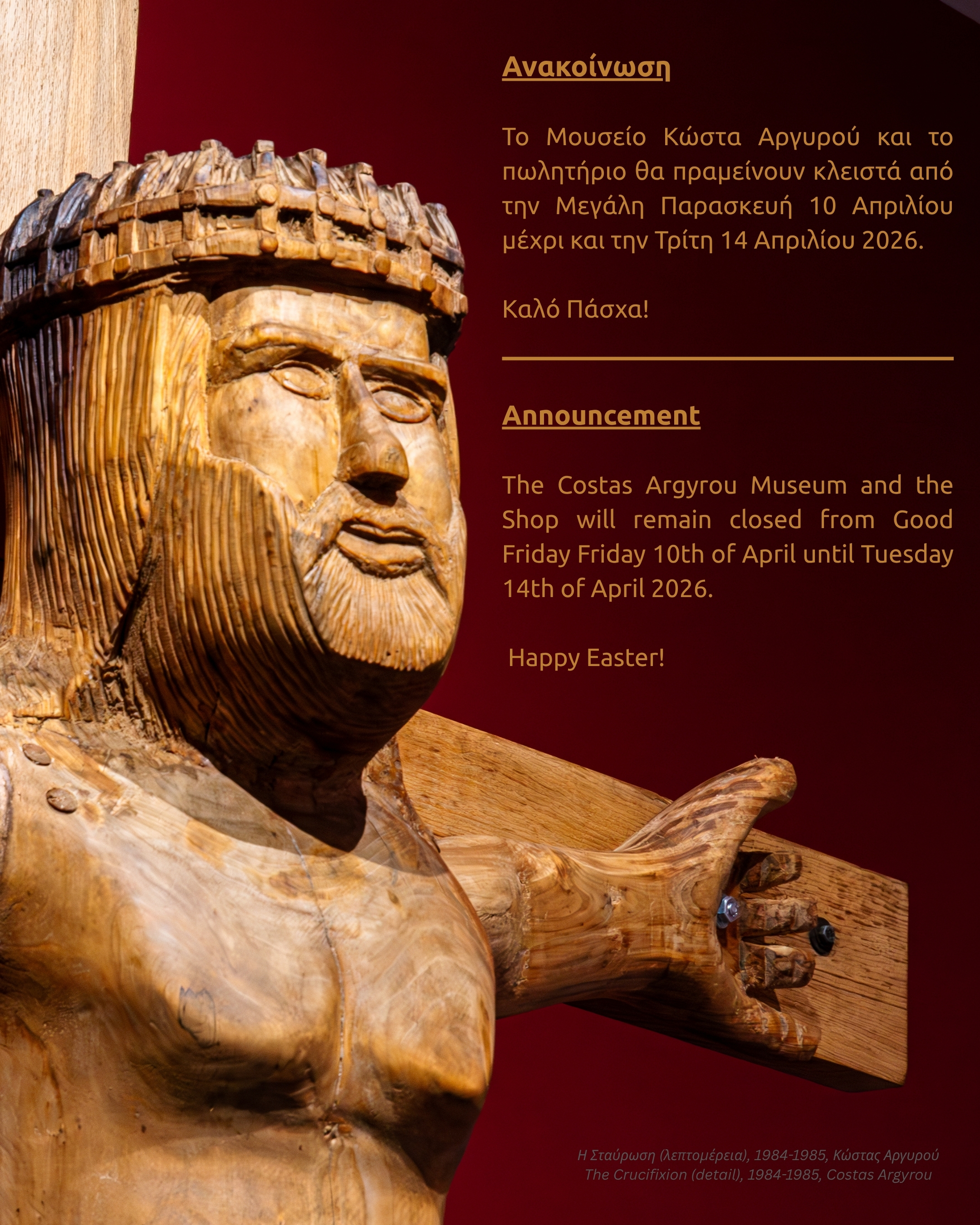 Το Μουσείο Κώστα Αργυρού πληροφορεί το κοινό ότι λόγω της συναυλίας «ΤΟ ΚΥΠΡΙΑΚΟ ΤΡΑΓΟΥΔΙ», την Παρασκευή 25 Οκτωβρίου 2024 το Μουσείο θα είναι ανοιχτό για το κοινό από τις 16:00 μέχρι τις 21:30.