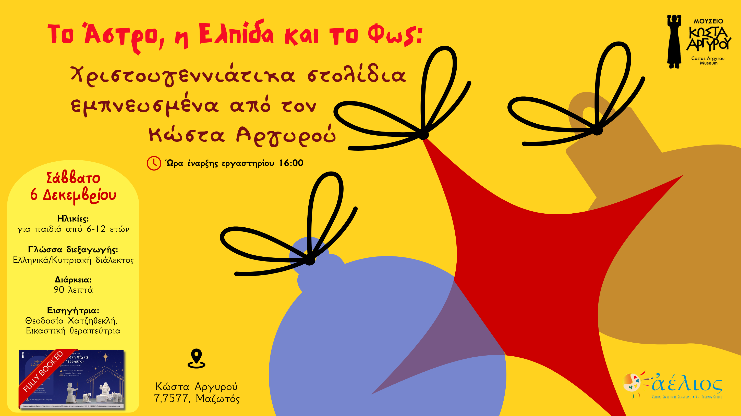 Έπειτα από τη μεγάλη ανταπόκριση του κοινού για το θεατρικό εργαστήρι «Ταξίδι στη Νύχτα της Γέννησης», το οποίο είναι πλήρως κρατημένο, ανακοινώνουμε την παράλληλη δράση «Το Άστρο, η Ελπίδα και το Φως: Χριστουγεννιάτικα στολίδια εμπνευσμένα από τον Κώστα Αργυρού», με την εικαστική θεραπεύτρια Θεοδοσία Χατζηθεκλή.