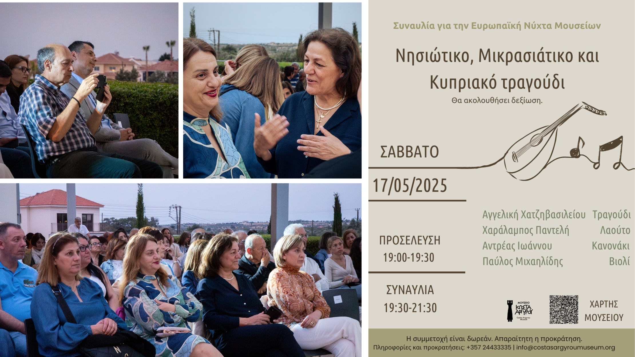 Με αφορμή την συμπλήρωση ενός έτους από την επαναλειτουργία του Μουσείου Κώστα Αργυρού, σας προσκαλούμε σε μια ξεχωριστή συναυλία με τον καταξιωμένο μουσικό και ερευνητή της κυπριακής μουσικής παράδοσης, Μιχάλη Χατζημιχαήλ και το μουσικό του σχήμα.